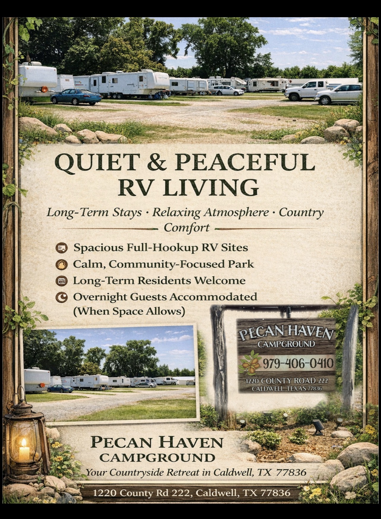 Welcome to Pecan Haven Campground, where we specialize in providing spacious full hook-up RV sites and a calm, community-focused environment. We welcome long-term residents and accommodate overnight guests when available, because we believe in creating an atmosphere with “Texas Backyard Hospitality”. (15-20min from Texas A&M University and Kyle Field)