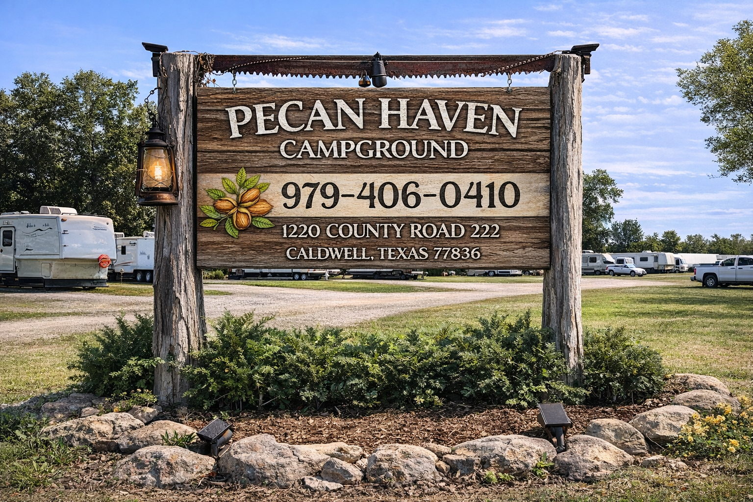 For more than 20 years, Pecan Haven has been a peaceful retreat where relaxation meets community in the heart of the Brazos Bottom—just 10 minutes east of Caldwell and 15 minutes west of Bryan/College Station.